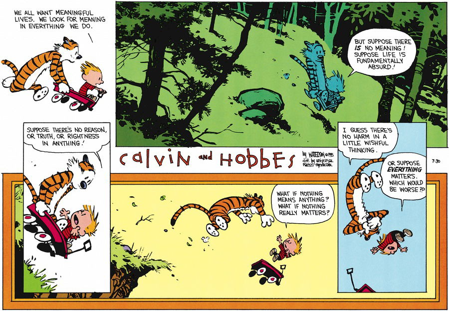 When he finally evaporates due to an “evil thought”, the best line in the entire history of the strip is uttered by Hobbes: “Another casualty of applied metaphysics.” Heck, if you are looking for academic cred, you could probably pen an entire dissertation on that one arc and what it says about the persistence and stability of personal identity and the Jungian shadow and such and so forth.
