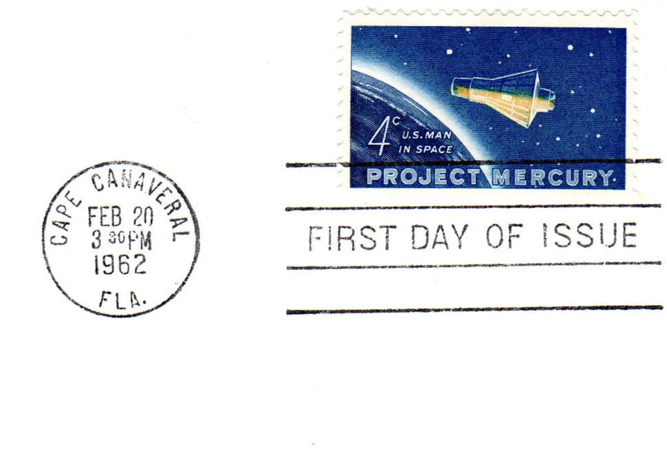 And it is acceptable to honor a living person’s accomplishment(s), such as was done for John Glenn’s historic orbital space flight … but since Glenn was still alive, his recognizable image could not be used and the stamp depicted only the Project Mercury capsule in space (Scott catalog #1193).