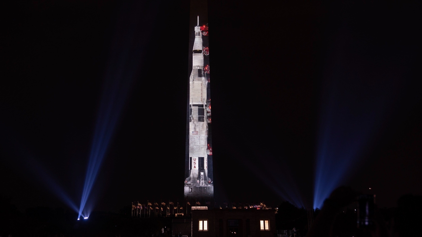The Washington Monument has been illuminated this week as a Saturn V rocket, in honor of the 50th anniversary of humanity’s first manned landing on the Moon.