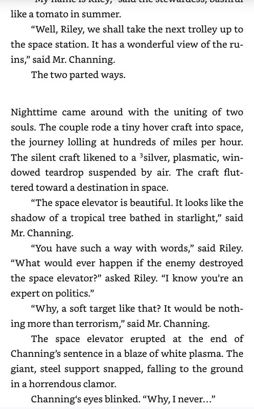 So the space elevator “snapped, falling to the ground.” I don’t think this guy knows how big a space elevator actually is. If, somehow, it were to fail in a way that brings it down, it would fall for many, many agonizing minutes, probably wrapping itself most of the way around the planet and creating catastrophic damage far in excess of a “horrendous clamor.” But hey, what do I know, I’m just a guy who’s read a couple of books.