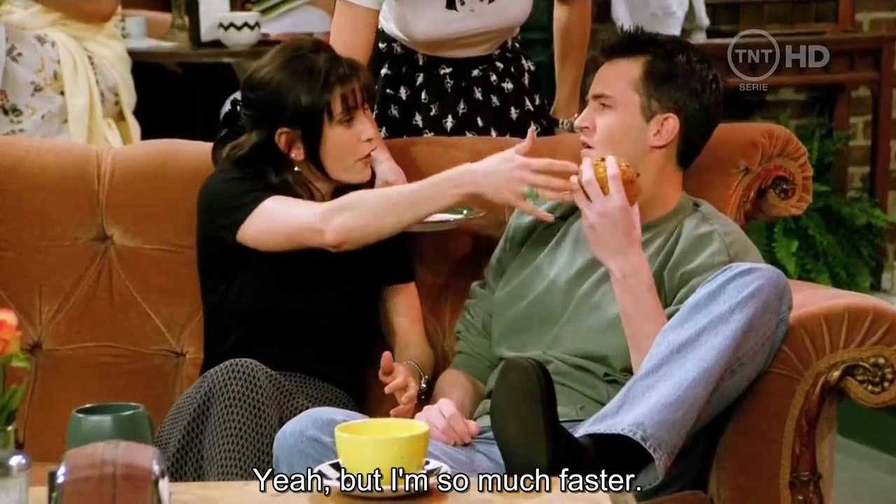 This was from one of the few Friends episodes I saw- pretty sure it was the bumper at the top of the show. They’re all sitting around the coffee shop talking about something, I can’t remember what. There was a muffin involved, and one or more of the guys licked it while Monica wasn’t looking. Her last line, delivered somewhat naively with regard to what she was saying, was:
