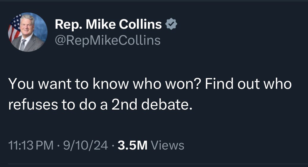 This is win-win for Harris. She does not need, nor probably want, another debate#. Why mess with perfection. But now she can keep asking for one - ready when you are, and just keep calling him a chicken for not doing it.