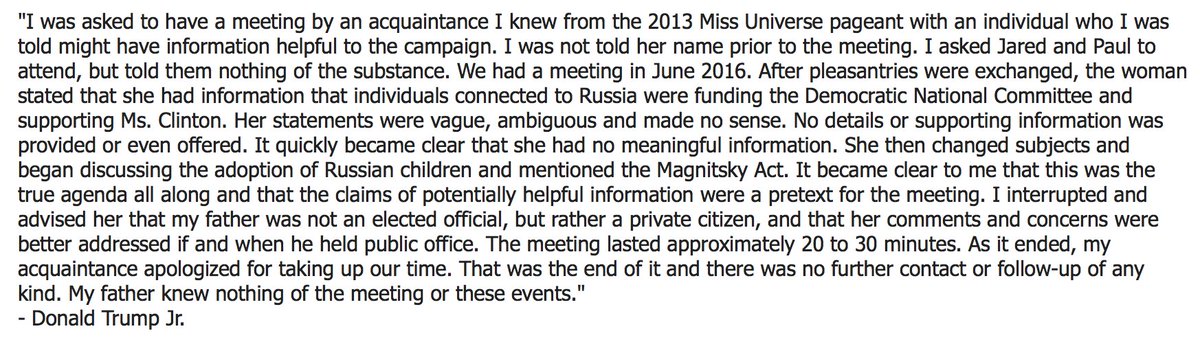 That Miss Universe pagent is the one held in Moscow. So this is Junior, right in the opening sentence, admitting that he was asked to take a meeting by an acquaintance from Moscow with a woman who could help the Trump campaign.