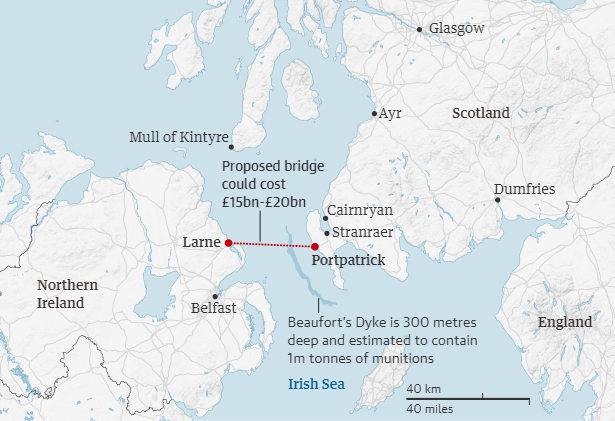 The most direct route for Boris Johnson’s idea of a 28-mile bridge would involve crossing Beaufort’s Dyke, a trench that contains more than 1m tonnes of unexploded munitions, plus chemical weapons and radioactive waste.