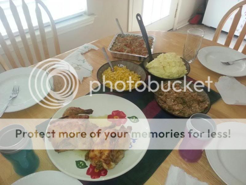 Here is the table all set, you can see the Cornish Game Hens, mashed potatoes(my husband said the best he has ever had), stuffing, green bean casserole, and corn first cooked on the cob then cut off the cob and reheated by sauteing with butter and pepper in a pan