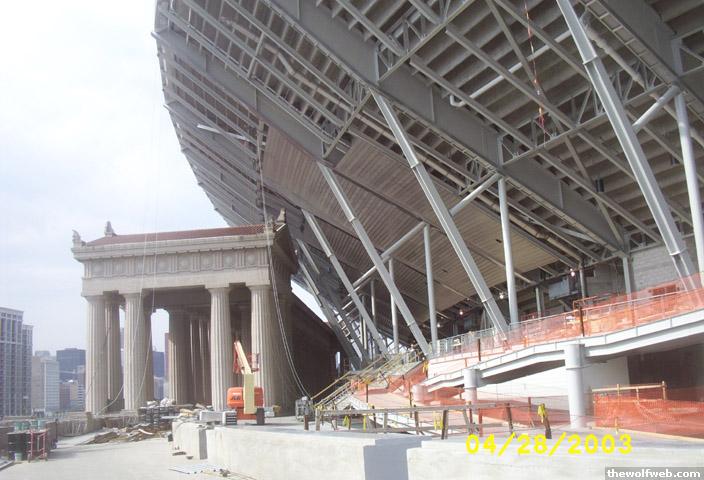 The proud parents have been inviting journalists to admire the new stadium, and no wonder. From the inside, it looks like an aesthetic success, as well as a huge improvement on a facility that was grossly obsolete–and as anyone who’s ever stood in line to use an overburdened portable toilet at Soldier Field can attest, the term “gross” applies in more ways than one. In the old park, only 40 percent of the seats were on the sidelines, with the majority in the end zones. The new, triple-deck arena puts 60 percent of fans on the sidelines.