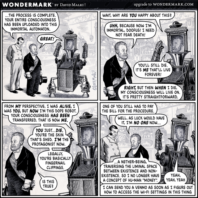 The classic comic on the subject of uploading consciousness from Wondermark: