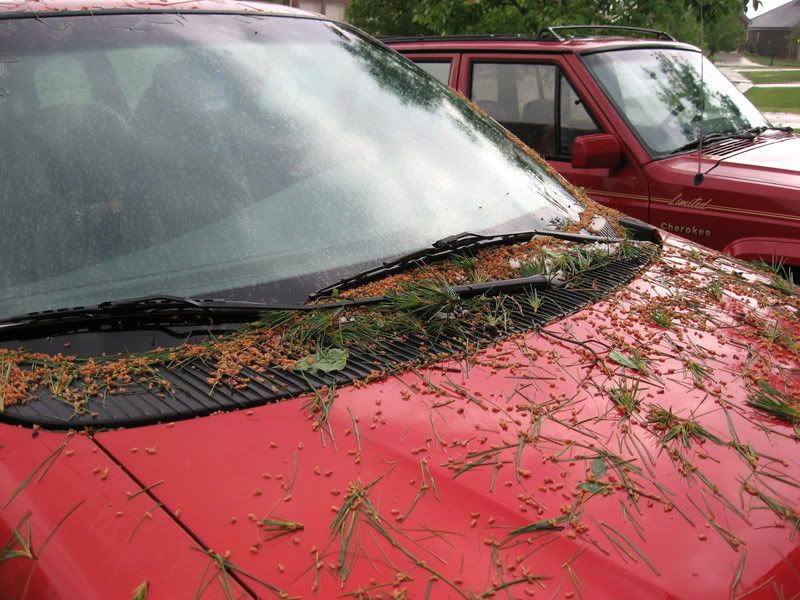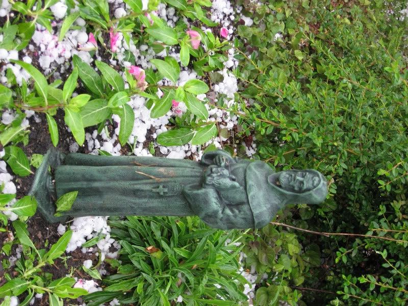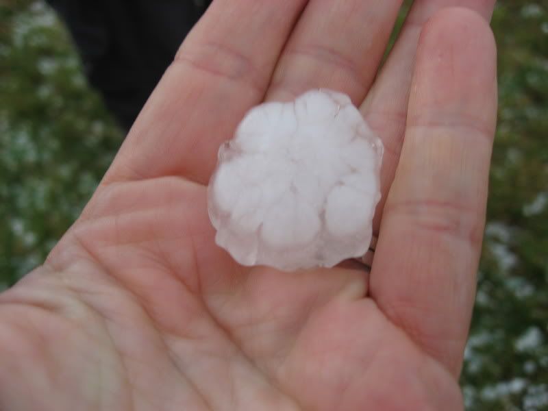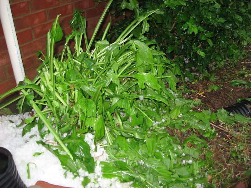 Well, anyway – yesterday we had a monster hail storm here! Monster! And we were in traffic when it happened. We had to hid under a tree to keep from getting pummeled to death. It was still loud. I have photographic evidence of the carnage. Giant hail stone