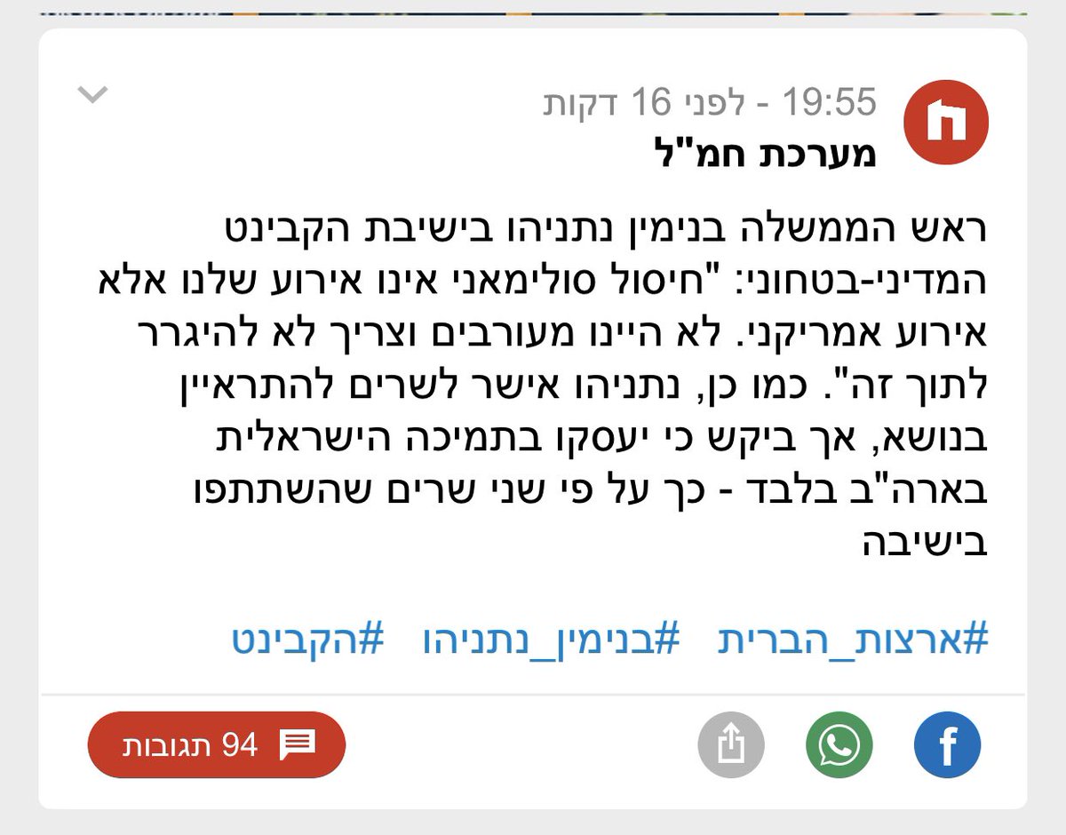 “The assassination of Soleimani isn’t an Israeli event but an American event. We were not involved and should not be dragged into it.”