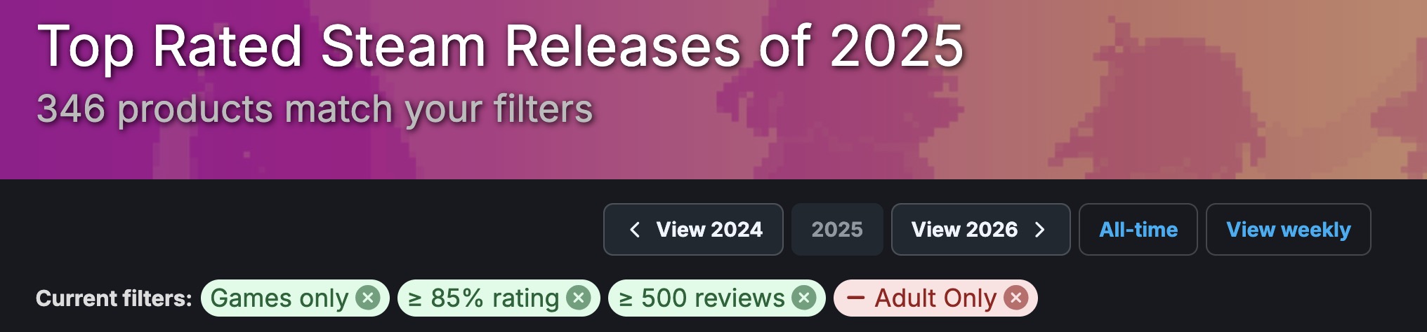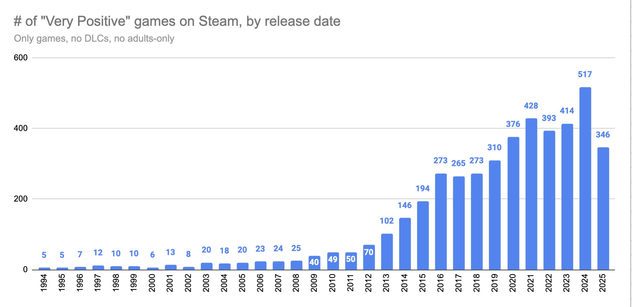 Maybe, but even if you applied saner filters (let’s say at least 500 reviews, 80% positive — e.g., “Very Positive” — only games and not DLC, not adult only), like this: https://steamdb.info/stats/gameratings/2025/?category=-888&displayOnly=Game&min_rating=85&min_reviews=500