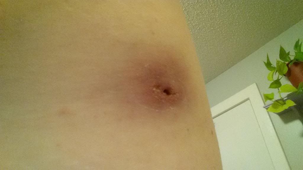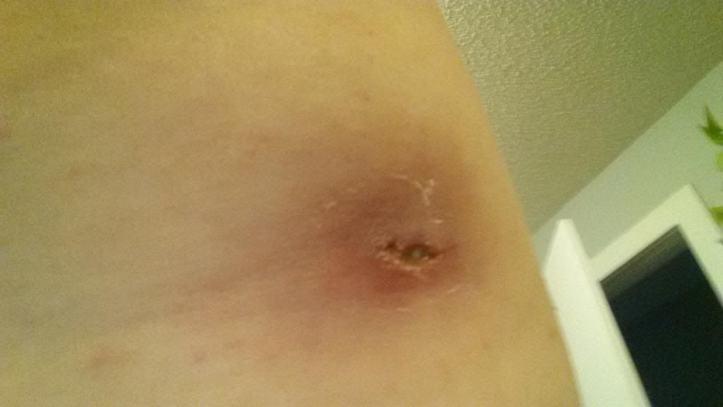 There is a hole now! OMG, no one told me anything about a hole. This freaks me out more than the spreading redness, the pain, and the pus. THERE IS A HOLE IN MY SHOULDER.