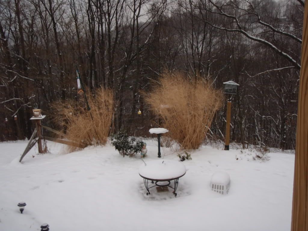 Keep in mind that I’ve only mentioned/shown stuff that will not directly identify Mr & Ms Wackjob. There is plenty more than I’ve shown. Take, for instance a comparison of our backyards. Here is the view from my back porch. Bird feeders, bird bath, etc. It looks nicer in the summer, but you get the idea.