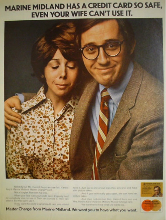 Here is a bank ad from about 1970, advertising a credit card “so safe, even your wife can’t use it.”