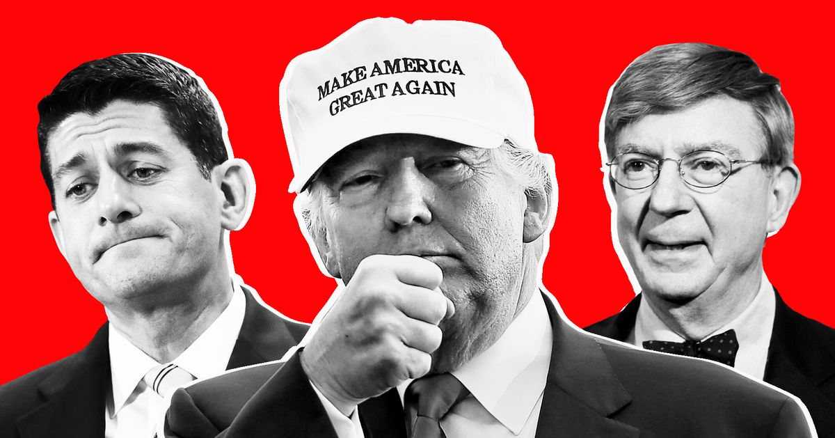 It is not only conservative leaders like Ryan (and Ted Cruz, and Marco Rubio) who have fallen behind Trump, but the followers, too. A recent Pew survey finds that three-quarters of conservative Republicans believe Trump represents their party’s core principles, while only half of moderate and liberal Republicans agree. It is the GOP’s tiny, withered left flank, not its bulging right one, that has put up the most resistance to the nominee. Among the rank and file, enthusiasm for Trump burns hot. Sean Hannity, who has positioned himself as among Trump’s most obsequious defenders, has seen his ratings soar. Members of Congress like Joe Heck and Jason Chaffetz, who disendorsed Trump, have come crawling back. George P. Bush has declared his support for the man who viciously bullied his father, which is like Marty McFly voting for Biff Tannen. Almost everybody who craves a future in Republican politics has concluded that their career depends on endorsing Trump.