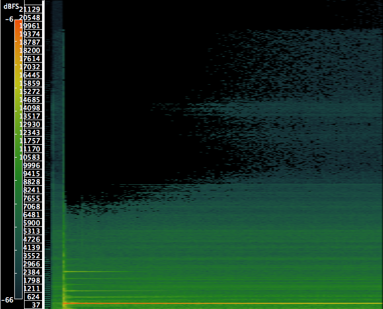 We move on to finger on glass. There’s a very noticeable (both visually and sonically) second harmonic. There are also inharmonic components that give the sound a distinctive colour. In a purely harmonic sound, the partials (horizontal lines) should be evenly spaced, but you can see that this is not entirely the case.