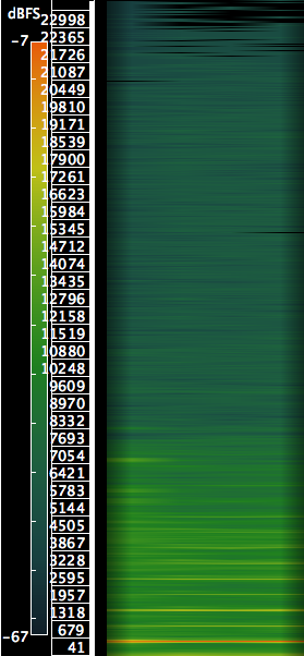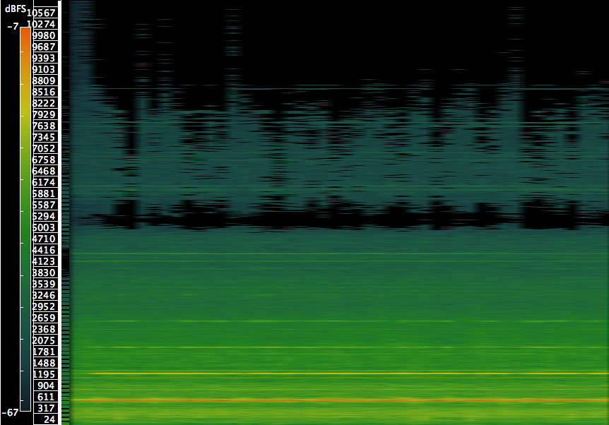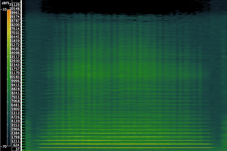 Let’s start with a transverse flute. The bright horizontal lines represent the harmonics. The fewer, the closer to a “pure” tone. As you can see, the transverse flute isn’t anywhere close to a sine tone. The vertical ripples are caused by slight vibrato and tremolo.