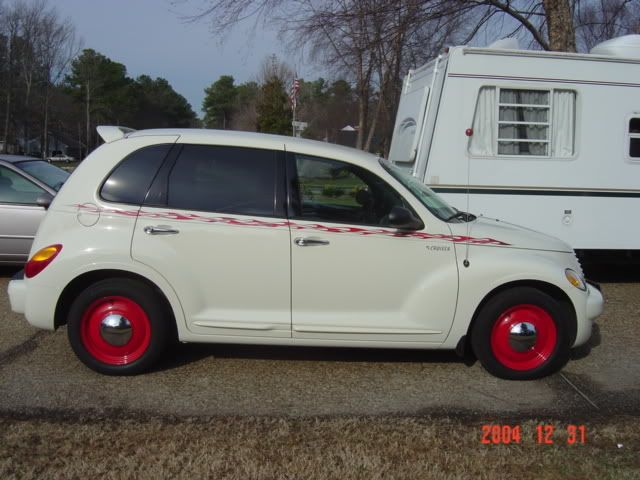 I would call it cream-colored. Chrysler calls it “Cool Vanilla.” I added the red flames and wheels myself.