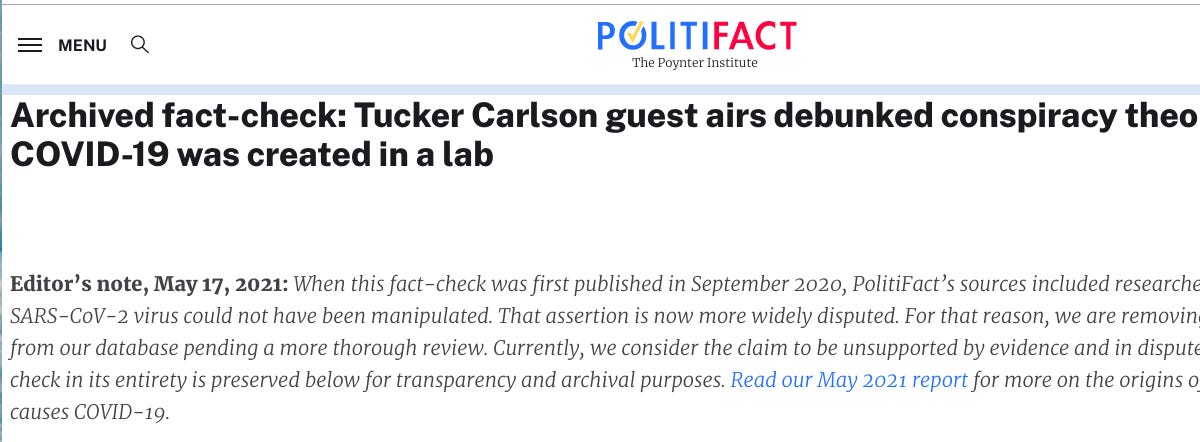 Within the space of a week, a cluster of theories called “lab leak” went from being considered misinformation and a mountain of conspiracy theories to, essentially, the mainstream. I’m not going to get into the details of the process here because it’s genuinely complicated. I have a lot of thoughts on this, but it deserves its own considered essay. Still, even at first glance, there are important lessons.