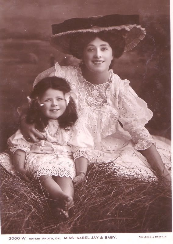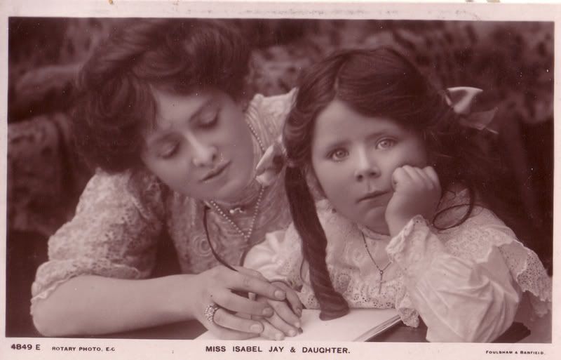 I don’t have a lot of money for this hobby so I don’t have a lot of stuff yet, but I have some focuses of interest. The one I have the most of are picture postcards of the Edwardian actress Isabel Jay, who posed for about 400 postcards during her career. I especially collect pictures of her with her young daughter Cecilia, because Isabel herself is the appearance model for a character in one of my stories, and Cecilia is the appearance model for her daughter.