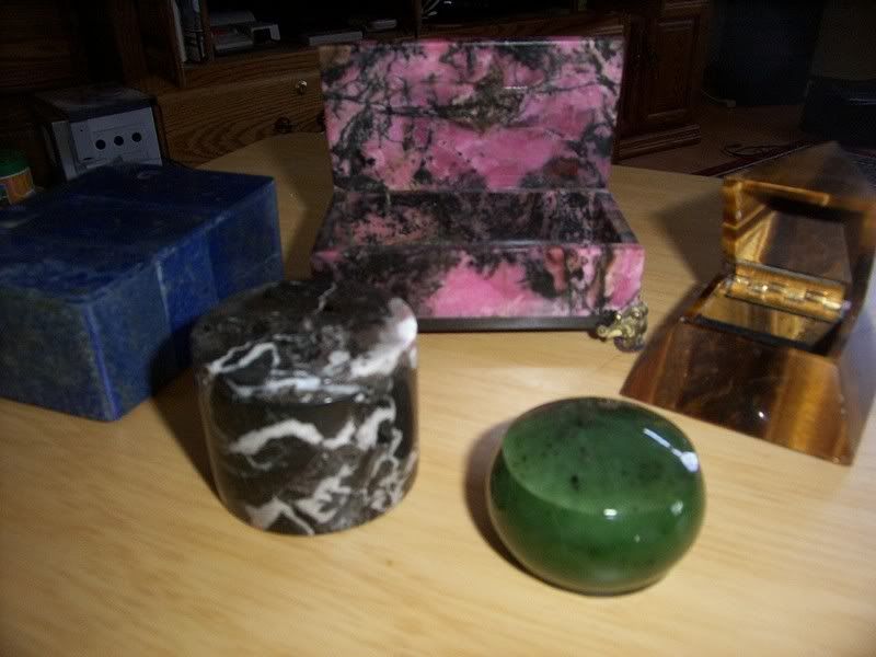 I collect trinket boxes. I have a large collection of many types, from about 60 different countries. A subset of the collection is of boxes made from semi-precious stones. Here is a grouping of some of my favorites, with the rhodonite box (pink) being my current favorite. (The others in the picture are lapis, marble, jade and tiger’s eye.)