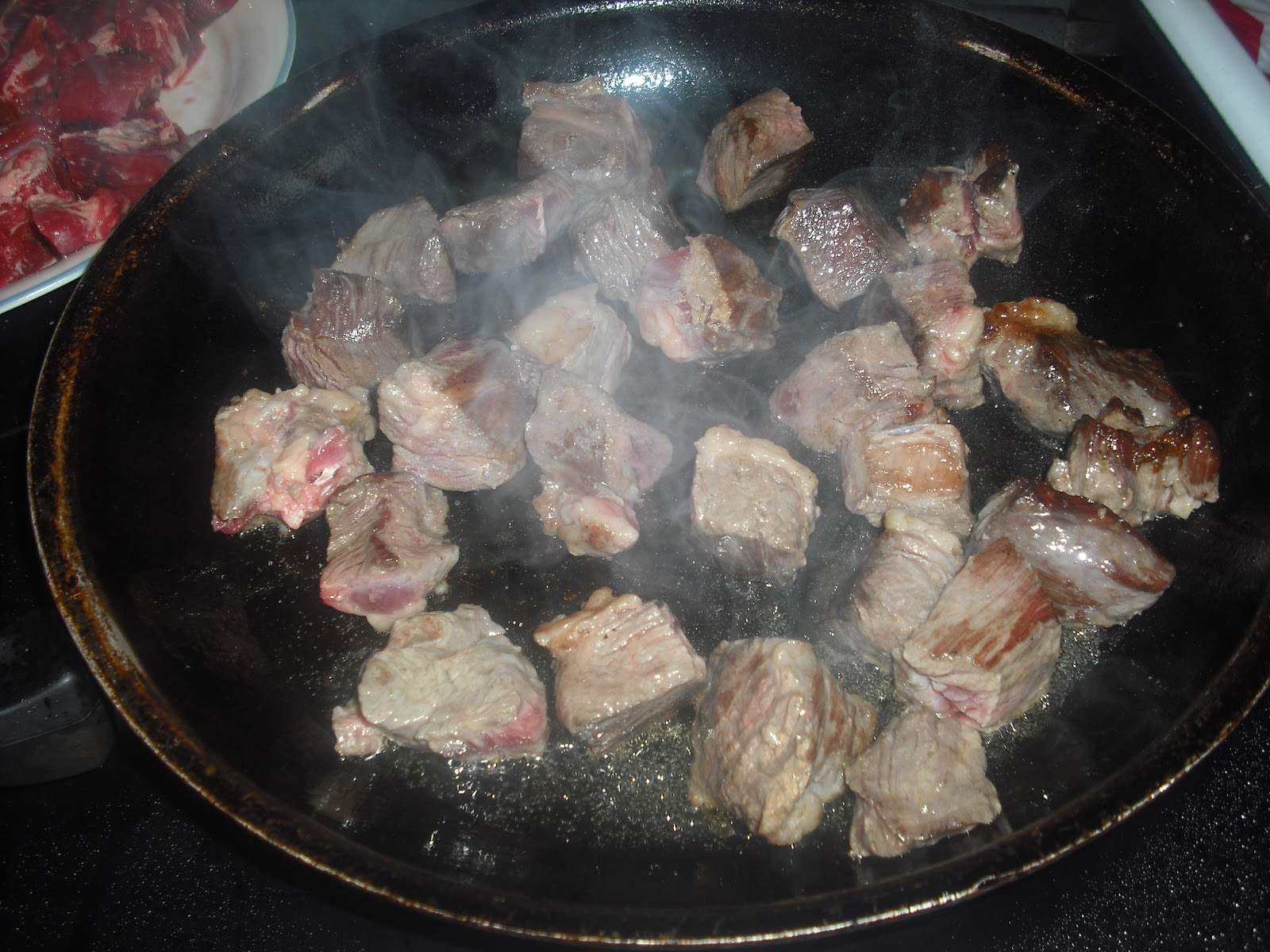 OK, here’s an example with chuck cubes that shows you the difference between browned and not browned. See the piece at 3 o’clock and near it that has the nice, dark brown bits. That’s browned meat. The piece in the center that is kind of by its lonesome is not really browned, and the pieces at 6 o’clock through 9 o’clock are mostly not browned. (Some have little flecks of browning, but for the most part, they are not browned. When a recipe is asking you to brown the meat, it’s looking for something along the lines of the meat at 3 o’clock.)