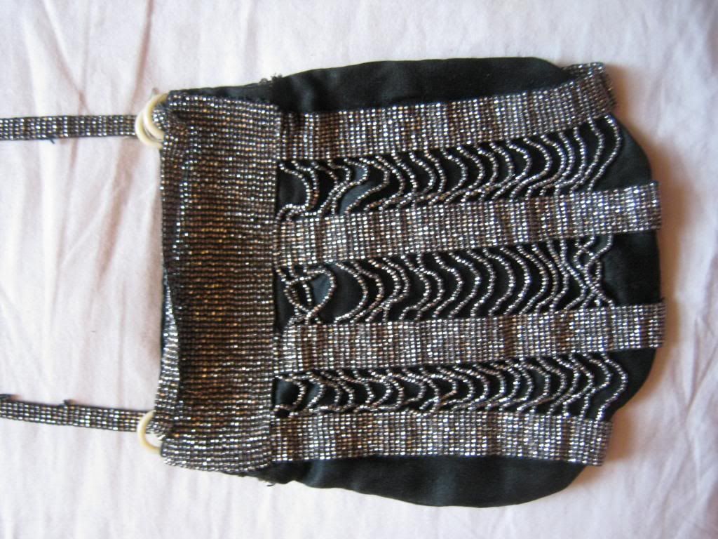 I have a purse heavily beaded with tiny marcasite beads. It has a long strap which slides through four ivory rings to be one long or two short straps. It is lined with purple silk, and at the top where the frame is it is reinforced with braided metallic threads.
