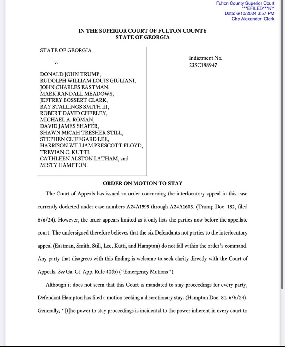 Ok so here it goes: while the trial case is stayed for people like Trump and others who appealed, those who did NOT appeal like Misty Hampton still have their case moving along.