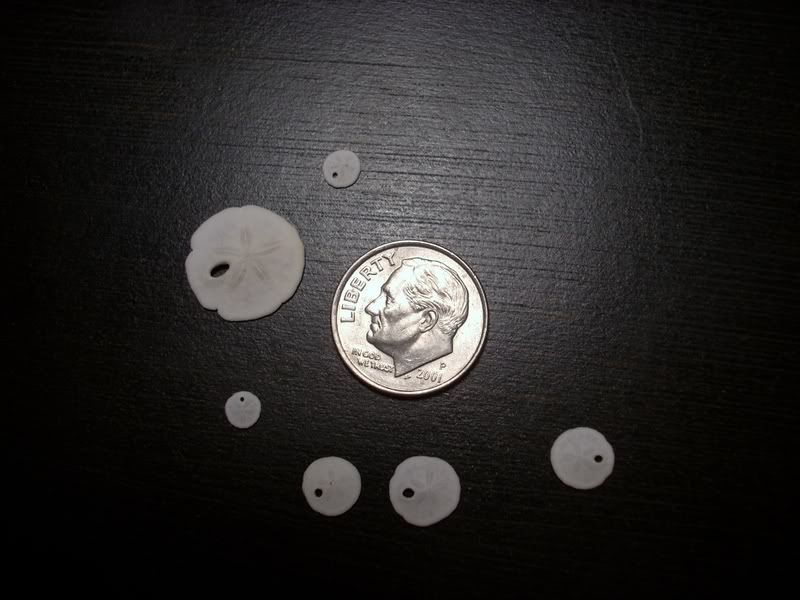 I found hundreds of tiny, bleached sand dollars washed up on shore on St. George Island, FL. Most were smaller than a dime and a lot of them were not much bigger around than a BB. I still have a bunch of them.