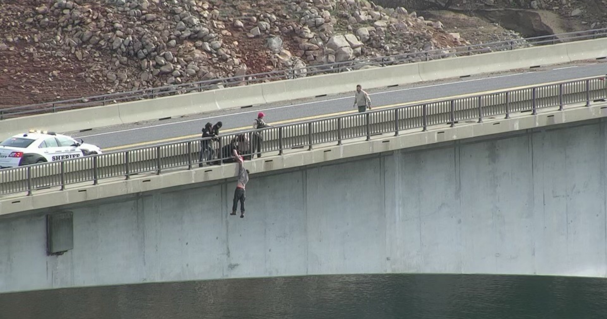 The cliche of catching a falling person with one hand was mentioned above, and coincidentally there was an actual case reported yesterday in Tuolumne County. A suicidal man jumped from a bridge and a sheriff’s deputy caught his arm on the descent and held him by one hand until assistance arrived to haul him up. There’s a photo of the victim hanging from the deputy’s hand in the cite: