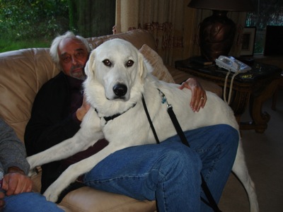 I think he is an Akita mixed with an Akbash. Size is my only indicator, as Akita’s don’t grow that big…do they? And an Akbash can be 250lbs.