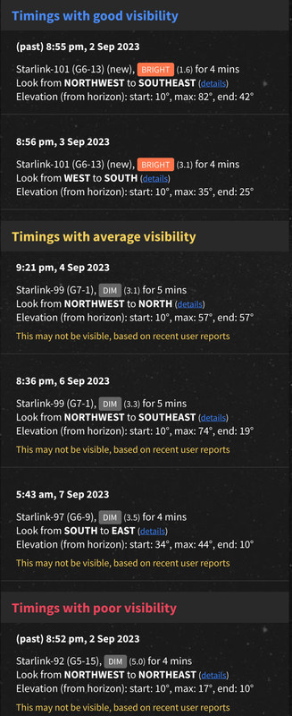 Saw my first Space-X satellite train just now thanks to the help of that page. I didn’t know if I would see anything because my property is completely surrounded by tall oaks, but they ended up passing nearly directly overhead. I didn’t get to see the full estimated four minutes the exposure, but still had a pretty good view.