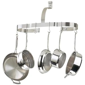Also, it would seem that, if you attach only the top strap to a stud, you’ll compromise the thing any time you remove a pan from it. When you take a pan off the left side, for example, the right side will be heavier, and with a single sturdy attachment point, the rack will “see-saw” a tiny bit. The imbalanced rack will exert a slight upward force on the left screw and a downward force on the right. Over time, those see-sawing forces will enlarge screw holes that only go into drywall, leaving you with a wobbly rack.