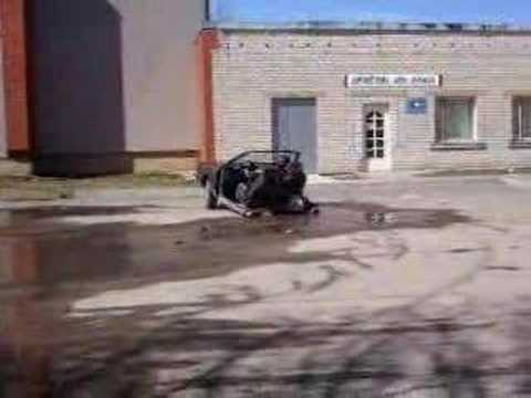 Then the passenger dashes down the road and hops into the front passenger seat. The driver gets back behind the wheel. Then the front half of the car continues on its way amid a shower of sparks from its trailing frame.