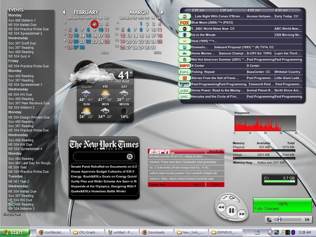 I forgot to add, I can post which specific widgets I am using if you guys want. Be forewarned about this program though, it takes up a bit of RAM and if you are low on that it might bog down yoursystem. For example, all of the widgets that I have running take up about 65 mb of RAM.