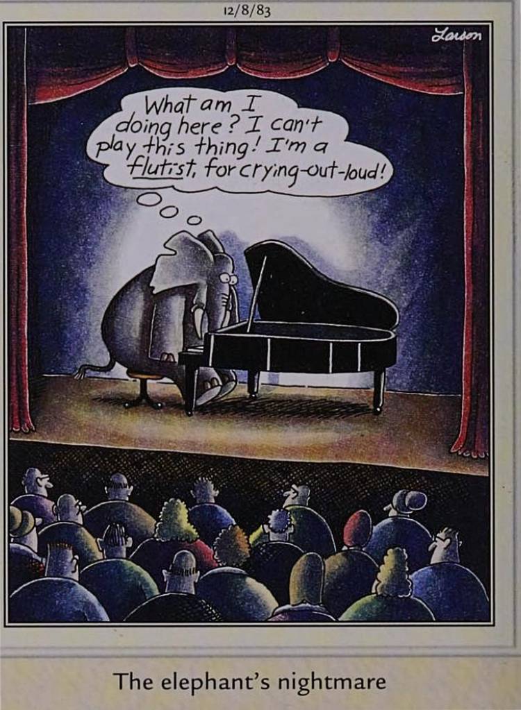 That reminds me of one of my most frequent recurring dreams: I’m attending a concert where I’m friends with the band. 10 minutes before showtime, they come to me and tell me “Our guitarist/drummer got sick and can’t perform. We only have you to stand in.” So I will be on stage, guitar round my neck or sticks in hand, the lights turn on, and I remember suddenly that I have no clue how to play the guitar/drums and don’t know the songs anyway. But I always get around by noodling on the guitar or randomly hitting the drum set. I have that dream at least once a month.