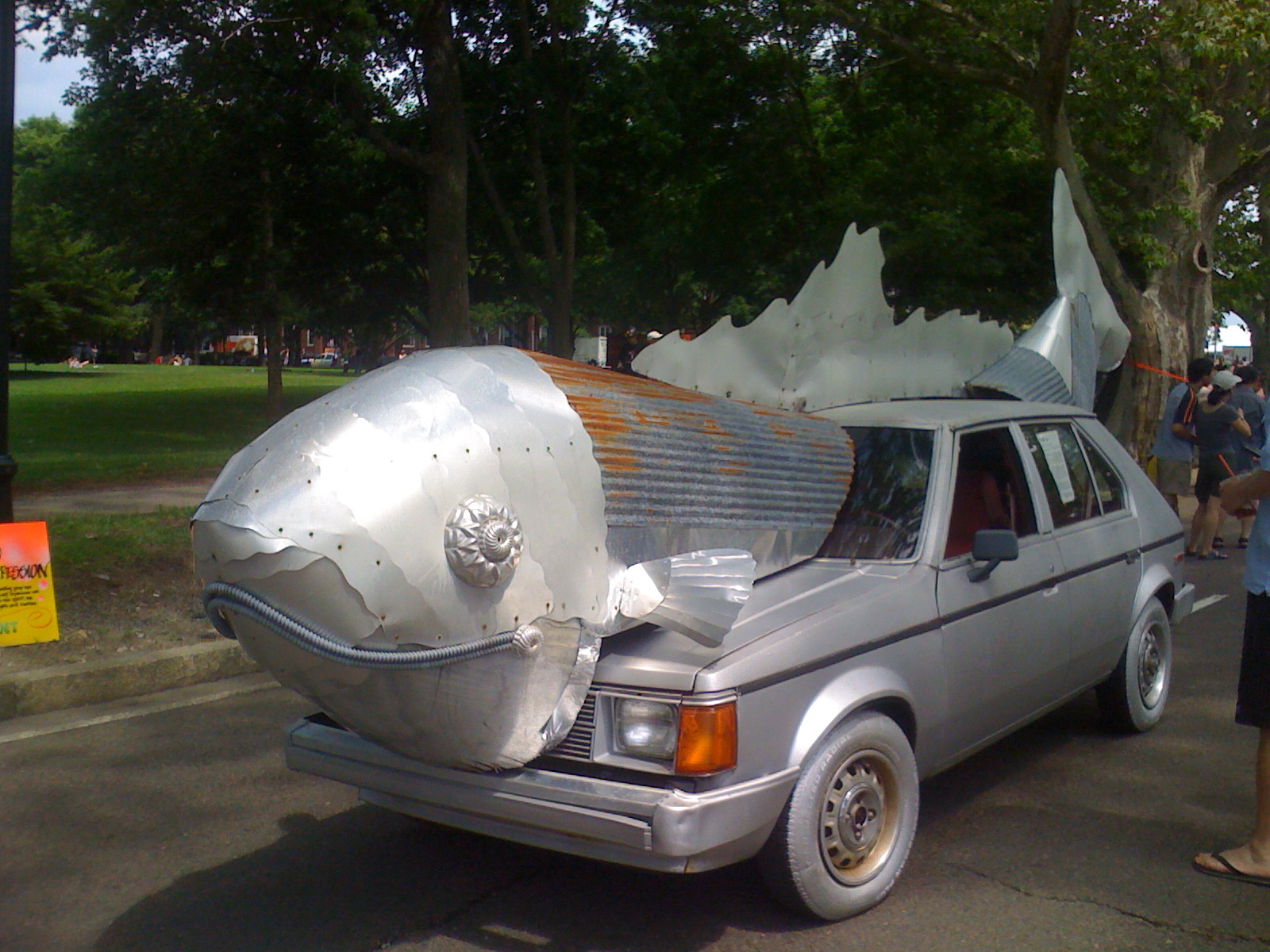 I live near a couple of Art Cars and see them fairly regularly in my neighborhood. We used to have a dragon mobile, an older Civic looking thing with a dragon head coming out of the roof, the sides painted like scales. I haven’t seen the penny car in a year or so, but I believe it’s still around somewhere.