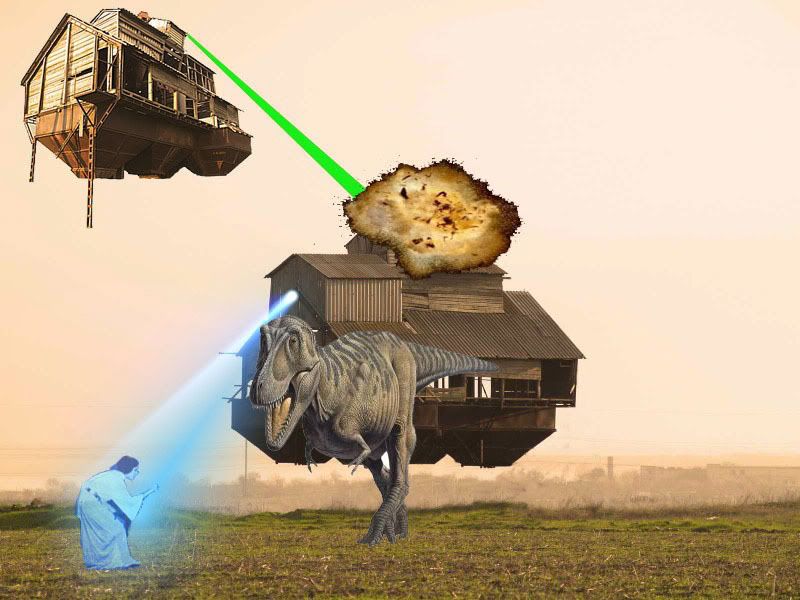 There are some minor artifacts, and the shadow placements don’t quite agree. I’m relatively certain that R2D2 was riding a dinosaur at noon, while the floating house battle shadow lines appear to indicate late afternoon.