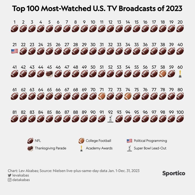 Generally you don’t request evidence for the null hypothesis, but the NFL doesn’t seem to be suffering. I suppose you could posit the counterfactual where the NFL holds 100 of the top 100 broadcasts of 2023 rather than a pathetic 94/100, but that seems far fetched.