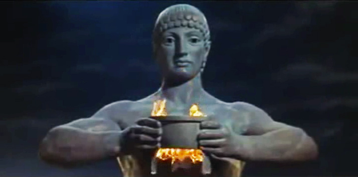 Ray Harryhausen was similarly inspired, in his Jason and the Argonauts, to have his bronze giant Talos assume a Colossus-like pose bestriding the harbor entrance, and pick up Jason’s passing Argo