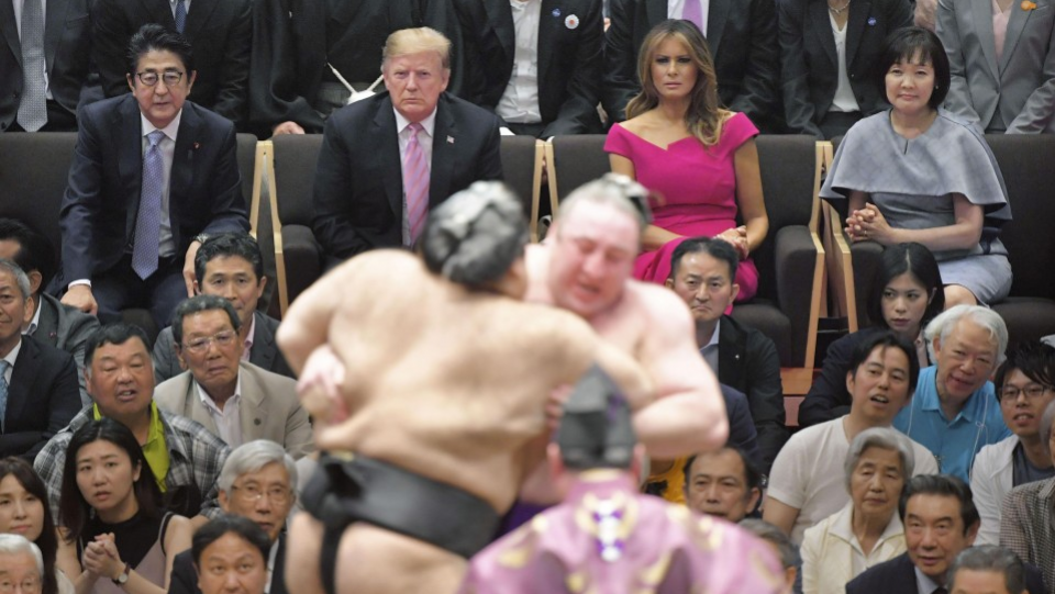 U.S. President Donald Trump attends sumo tournament in Tokyo, watching the action from a specially prepared seat near the ring