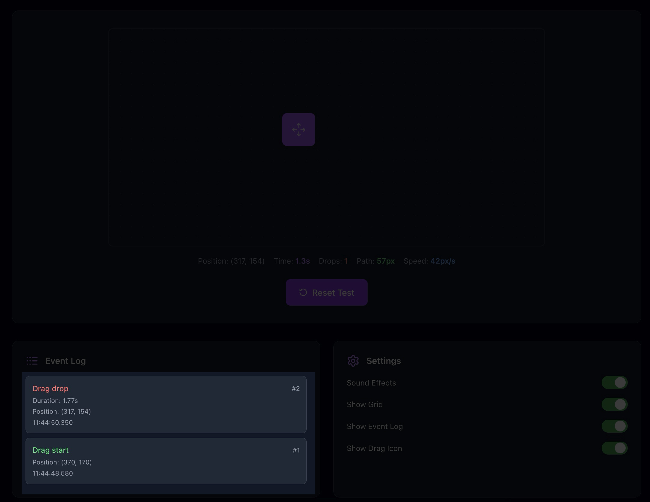 e.g. you should see a “Drag start” in the log when you hold down the mouse button, the drag area should be highlighted purple while you’re dragging, and then you should see a drag drop at the end.