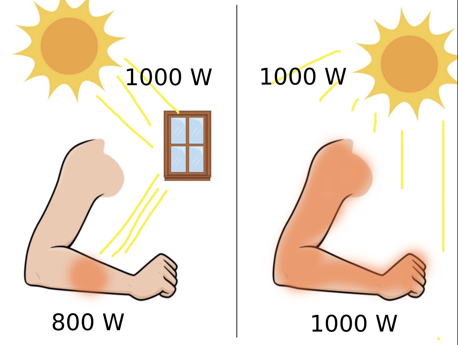 At point A I’m in the shadow of the east house. If I look at the sun beam reflecting off the window, it feels very warm on my face. At point B, I’m in the sunbeam itself. If I look at the sun directly, it doesn’t feel as warm on my face as it does when it’s reflected off the window. This surprises me since I would think the sun from the window would be less intense. Some light is lost by going into the house and the reflected light is scattered more. It seems like the beam of sun directly hitting my face at point B should feel warmer than the reflected light at point A. But instead, it feels like the sun light is being magnified when it’s reflecting off the window. What would explain this apparent temperature difference that makes the reflected light feel warmer than the direct light?