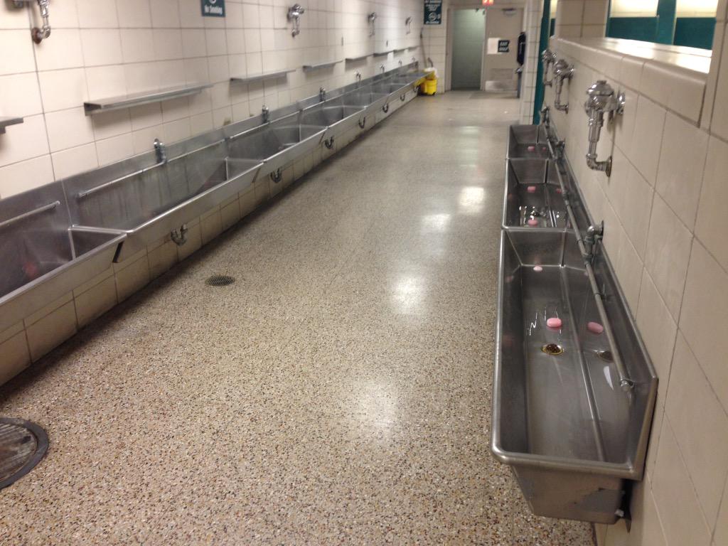My workplace has several thousand employees. Most of the men’s rooms only have 1 stall and 1 urinal, if they work. So that eliminates the issue. However there is one bigger restroom with 2 urinals and 2 stalls, and 2 bigger breakrooms with 5-6 urinals and stalls.