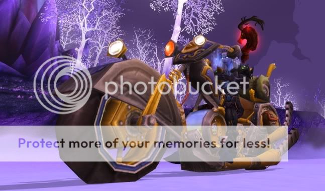 I constructed my Hunter a Mekgineer’s Chopper. It cost around 11k in materials (would’ve cost closer to 14k but I got lucky when I skinned one part from the Ulduar mechanical bosses), and it was worth every penny. Riding that thing around while listening to Born To Be Wild is awesome. Here’s a picture if you don’t know what a spacegoat riding a motorcycle looks like: