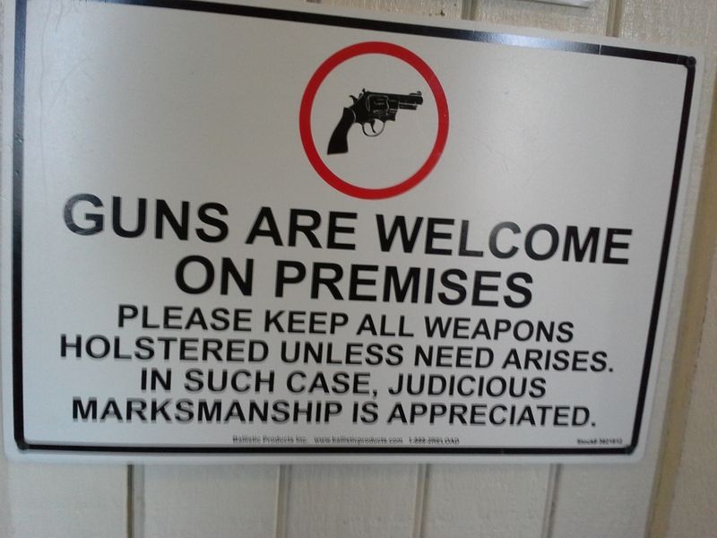 *In Texas, any sign forbidding weapons has to follow strict guidelines or it is invalid. If the property owner doesn’t follow the guidelines exactly (including wording, letter height, contrast, etc.), then it is legal for us to ignore it and keep our weapons. By some odd coincidence, the statute number is “thirty-ought-six” (popular deer rifle ammo).