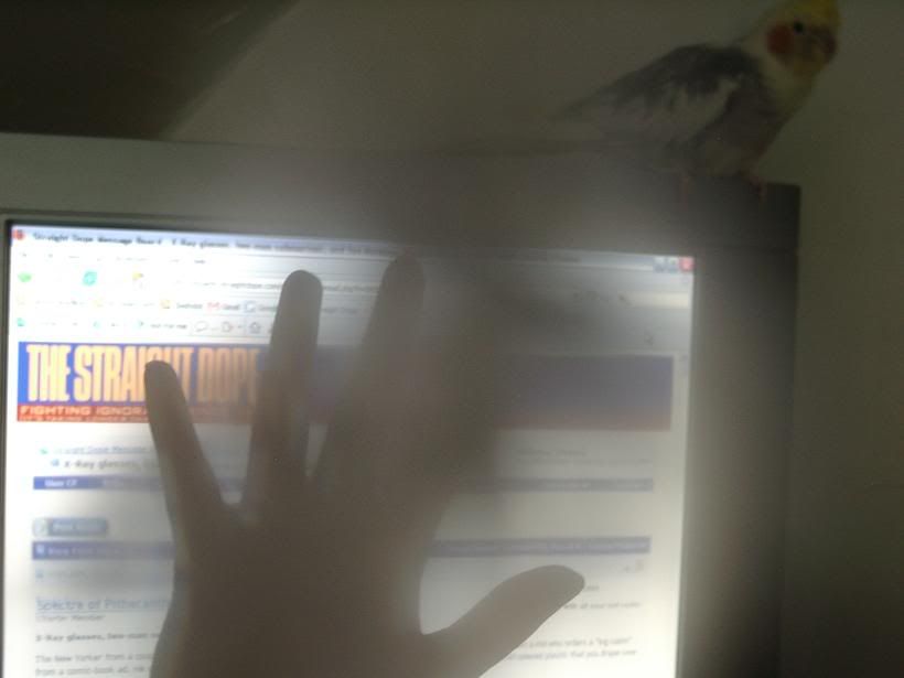 I had a pair of X-ray glasses sitting around, so I thought I’d show the effect. Well, technically, these are glasses that make little snowflakes appear around Christmas tree lights, but they do the same thing as some X-ray glasses I sent away for as a kid (from a cereal box, though, not a comic book). The actual effect is a little more impressive in person, but this is the best I could get taping the glasses to the front of my digital camera. You can get an idea of how the illusion works, though.