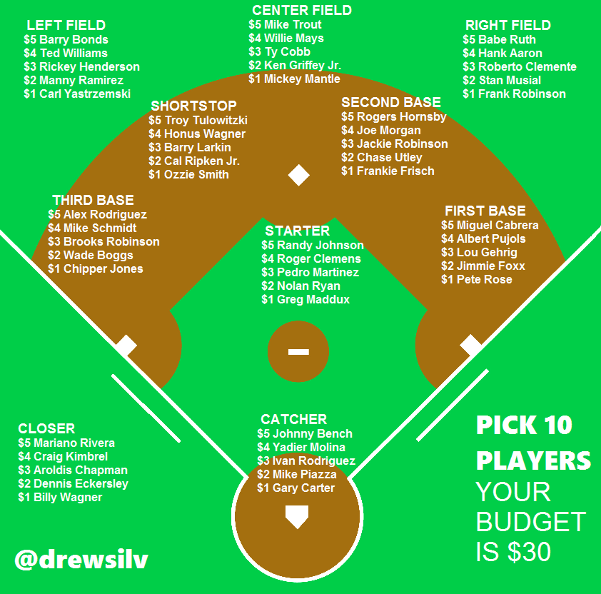 1 - You have $35 to pick 8 position players, 3 starting pitchers, and one closer.