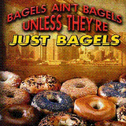 Just Bagels —a solidly established bagel joint in the Bronx, their ad logo, painted everywhere, is Bagels ain’t bagels unless they’re Just Bagels. Around the back of their store for awhile in the 1990s they’d apparently decided to expand operations, insofar as they had, painted on their brickwork, the information that “Just Bagels isn’t just bagels any more!”